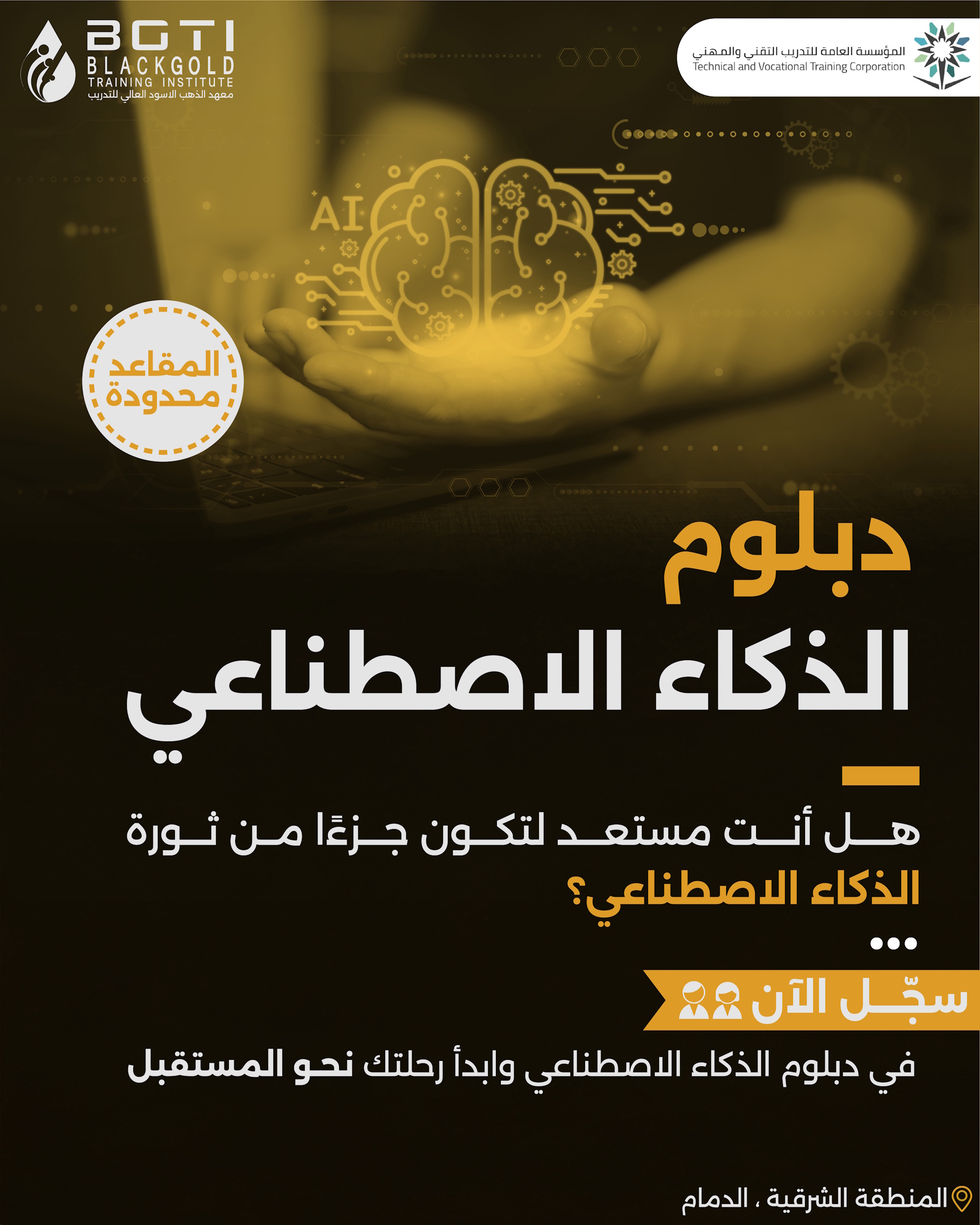 صمم دبلوم الذكاء الاصطناعي في قسم الحاسب و تقنية المعلومات بما يتوافق مع احتياجات سوق العمل المحلية للتخصص، ويتم التدريب في هذا التخصص في خمسة فصول تدريبية نصفية مجزأة ,